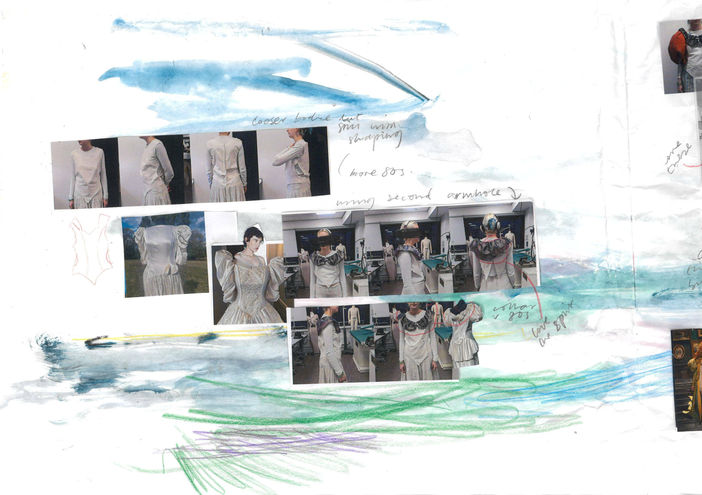 For this project, I drew from a very strong emotional tether, having been broken up with just before I restarted university. I wanted to create a highly theatrical and dramatic character and dress her. I restricted the colour scheme to white, emphasising the detail of texture and clashing prints.